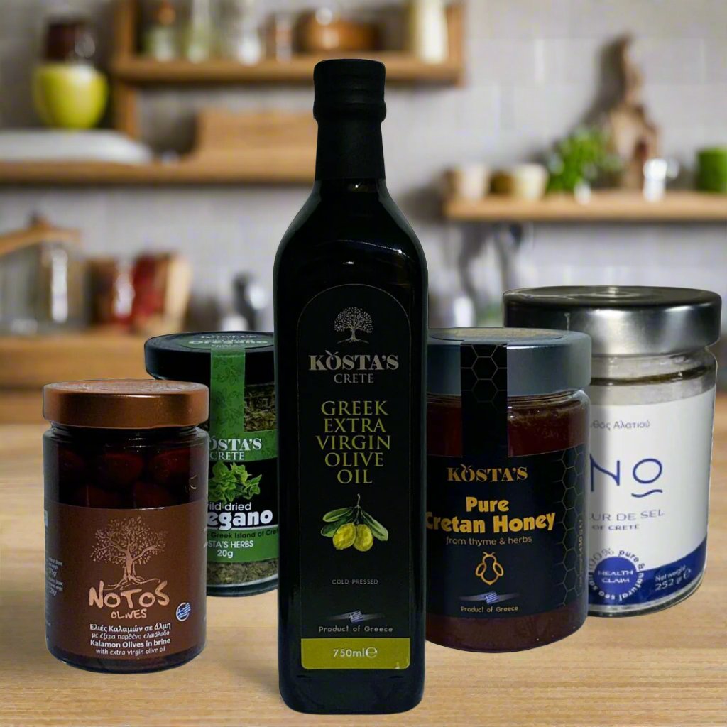 Bring a hint of herbal warmth to your meals with 20g of wild dried oregano, handpicked for its robust aroma and earthy notes. Our Kalamon olives offer a deep, fruity flavour, ideal for snacking or enhancing salads and spreads. Finally, our large jar of Cretan sea salt, gathered from the island’s pristine coastlines, adds a touch of Mediterranean magic to every dish.